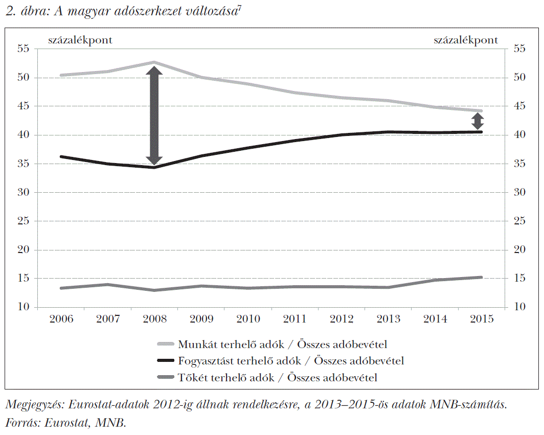 A teljes népességen belüli munkaerőpiaci aktivitás és a foglalkoztatottak létszámának növelése az adórendszer ösztönzőin, például a munkát terhelő adók csökkentésén keresztül is lehetséges. Bár a 2010 után meghozott reformintézkedések eredményeképpen a magyar munkaerőpiaci adatok jelentős mértékben javultak, régiós összevetésben azonban továbbra sem kiemelkedőek, így a kötet szerint további intézkedések lehetnek indokoltak e téren. A munkaerőpiac keresleti és kínálati oldalát egyaránt élénkítő intézkedés a munkát terhelő adók csökkentése. A szakirodalom, valamint a nemzetközi szervezetek ajánlásai (Európai Bizottság, IMF, OECD, Világbank) szerint a tőkét terhelő adók mellett a munkára rakódó adóterhek a leginkább károsak és torzítóak a gazdaság számára. Éppen ezért széles körű egyetértés van a téren, hogy az adószerkezet átalakítása hatékonyabb, ha az adócentralizáció súlya a munkát terhelő adókról inkább a fogyasztást terhelő adókra helyeződik. Az ilyen jellegű struktúraváltás csökkenti az adóztatás gazdaságtorzító hatásait, elősegíti a gazdaság fehéredését, hosszú távon is növeli a foglalkoztatást, a reálnövekedést, és javítja a versenyképességet.6 A 2010 utáni fiskális politika is ezt az irányt követte (2. ábra), például az egykulcsos, arányos személyi jövedelemadó (szja) bevezetésével és csökkentésével, ami – a nettó bérek növelésével – a munkakínálatot az extenzív mellett az intenzív határon is ösztönözte, továbbá mérsékelte a jövedelemeltitkolásra való hajlandóságot a munkavállalói és a munkáltatói oldalon egyaránt. Az szja további csökkentését támogatja az MNB kötete is. Ezenfelül a munkára rakódó terheket csökkentik a Munkahelyvédelmi Akcióterv (MAT) keretein belül korábban bevezetett célzott – 850–900 ezer foglalkoztatottat támogató – munkáltatói járulékkedvezmények, amelyek növelésére, valamint a kedvezmények munkavállalókra történő kiterjesztésére szintén tesz javaslatot a kötet. Ebbe a versenyképességet növelő adópolitikai irányba illeszkedik a kormányzat 2016. novemberi döntése, miszerint 2017-ben a munkáltatói járulékkulcsok jelentős mértékben – 27 százalékról 22 százalékra – csökkennek, valamint 2018-ban további 2 vagy 2,5 százalékkal mérséklődnek, ami a bérnövekedés függvényében 2019–2022-ben is folytatódhat. Emellett 2017-ben a minimálbér 111 ezer forintról 127 650 forintra, a garantált bérminimum pedig 129 ezer forintról 161 250 forintra emelkedik (2018-ban további 8, illetve 12 százalékos növekedés várható). Ezen intézkedések egymást erősítve, érdemben ösztönzik a munkavállalást, és hozzájárulhatnak az egyes településeken és szektorokban jellemző munkaerőhiány enyhítéséhez.7