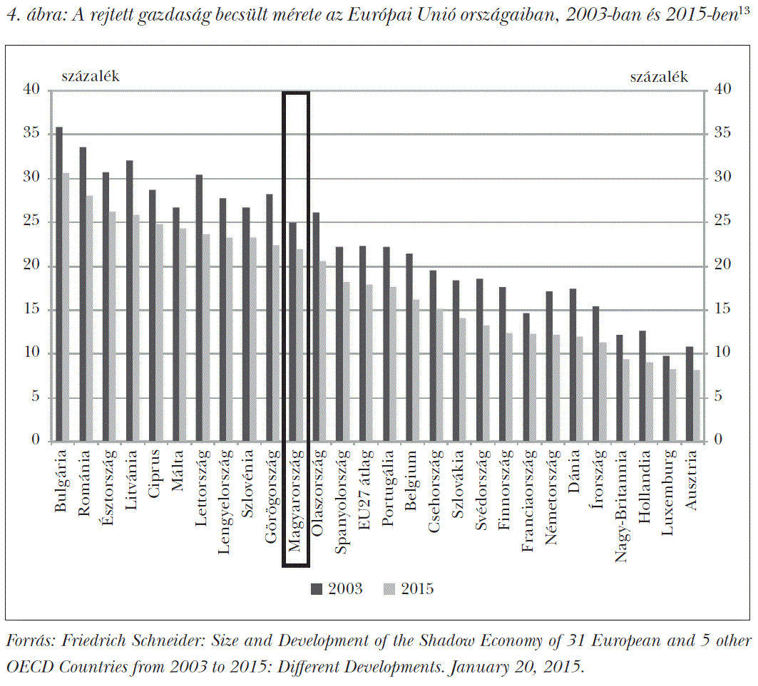 Az adóelkerülés mérséklése is jótékony hatással lehet a vállalati innovációra, ami a termelékenység javulásán keresztül pozitívan hat a potenciális növekedésre.10 Az adóelkerülés torzítja a versenyt és a hatékony tőkeallokációt, rontja a költségvetés pozícióit, valamint csökkenti a munkavállalók szociális, jogi és anyagi biztonságát. Az adóelkerülés GDP-arányos becsült mértékét illetően Magyarország (2015-ben 22 százalék) szintén nem lóg ki a régiós versenytársak közül, azonban kissé meghaladja az uniós átlagot (17 százalék)11 (4. ábra).13
