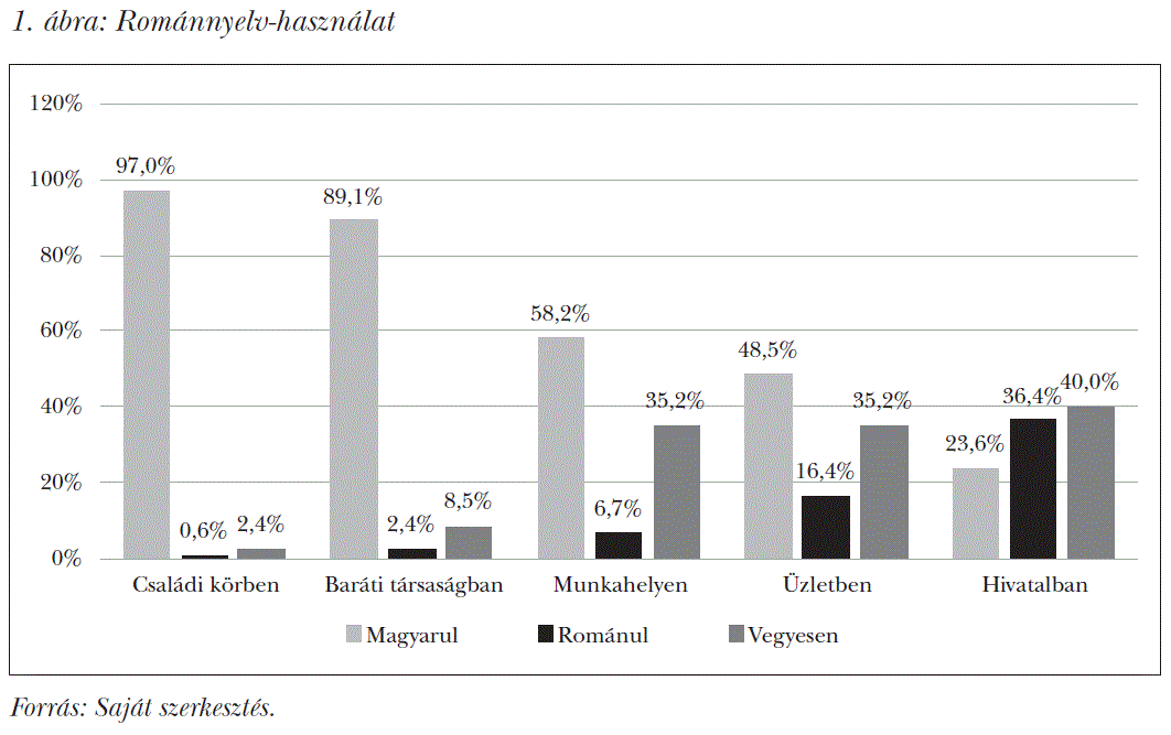 A válaszadók szűkebb családi körben magyarul beszélnek, a teljes mintából csupán ketten beszélnek főként románul. A baráti társaságok esetében még mindig döntően a magyar a használatos nyelv (89,1%), a munkahelyen viszont a válaszadók valamivel több mint fele magyarul beszél. Az üzletekben már kevesebb lehetőség van az anyanyelv használatára (48,5%), a hivatalokban pedig még kevesebb. Az erdélyi magyarok tehát anyanyelvüket csak a társadalmi élet szűkebb szféráiban, a családi és a baráti körben használják. Csupán a Székelyföldön mutatható ki, hogy a válaszadók mind az 5 területen tudnak magyarul kommunikálni, erre is csupán a kitöltők 14,5%-ának van lehetősége (1. ábra).