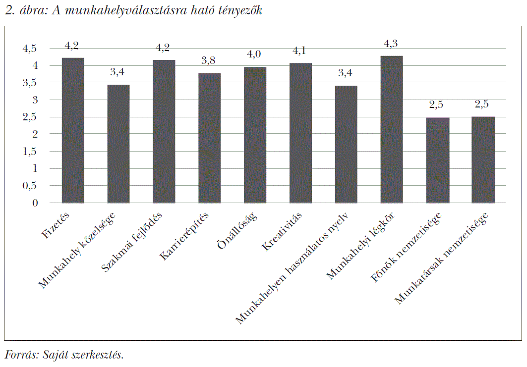 A munkahelyválasztást befolyásoló tényezők 5-ös skáláján a legfontosabb a munkahelyi légkör (4,3). Ezt szorosan követi a fizetés, valamint a szakmai fejlődés (4,2). Szerepet játszik még a kreativitás (4,1), az önállóság (4,0) és a karrierépítés lehetősége is (3,8). A munkahely közelsége és a munkahelyen használatos nyelv nem játszik döntő szerepet a válaszok alapján. Az utolsó helyen a vezető és a munkatársak nemzetisége áll (2,5). Ebből arra lehet következtetni, hogy a különböző nemzetiségek között nincs olyan ellentét, amely befolyásolná a munkahelyi életet (2. ábra).