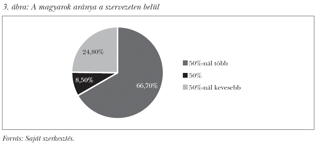 A válaszadók 67,3%-ának magyar nemzetiségű, 25,2%-ának román, 4,4%-ának német, 0,6%-ának dán, 0,6%-ának koreai, 1,3%-ának olasz és 0,6%-ának pedig osztrák a vezetője, illetve munkáltatója. A szervezetek 66,7%-ában a magyarok aránya meghaladja az 50%-ot, 8,5%-ában fele-fele arányban oszlanak meg, míg 24,8%-ában 50% alatt van a magyarok aránya. A magyarok vállalaton belüli aránya ott alacsonyabb, ahol elsősorban elszórtan élnek (3. ábra).