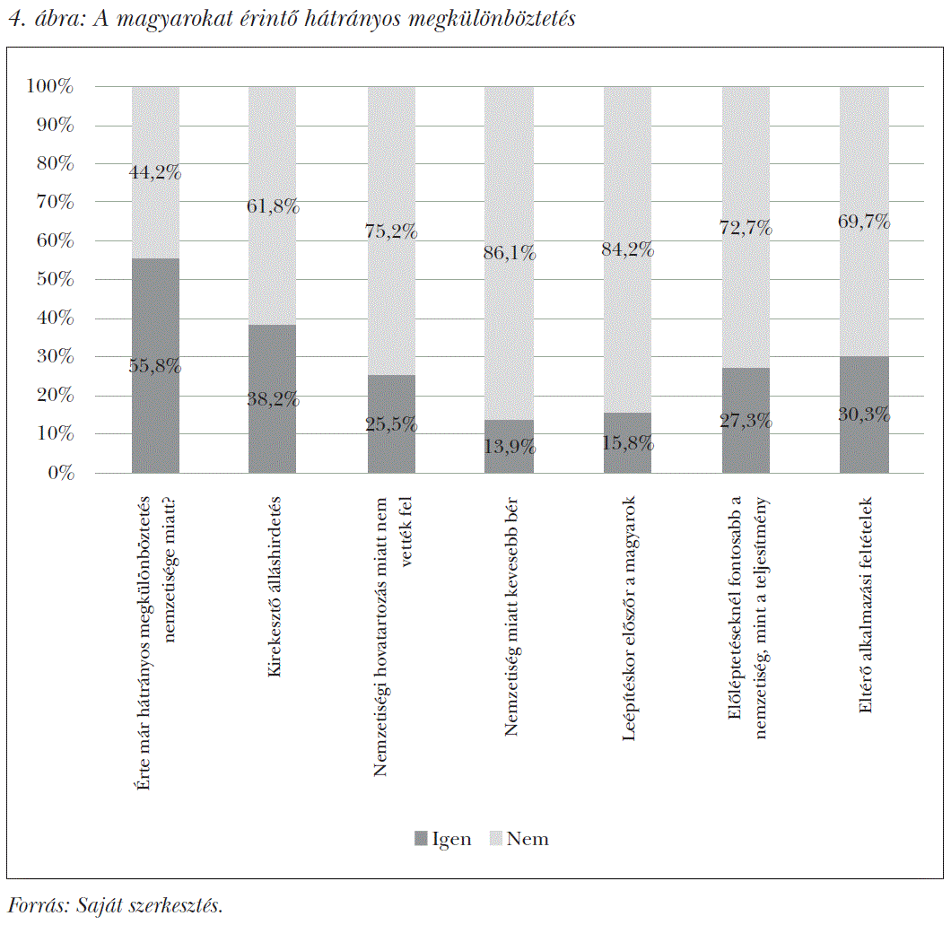 Kutatásunk fókuszában az áll, milyen mértékben éri az erdélyi magyar munkavállalókat negatív diszkrimináció a romániai munkaerőpiacon. A válaszadók több mint felét (55,8%) érte hátrányos megkülönböztetés, általában a nemzetiségük miatt. A munkához való hozzájutás tekintetében a kitöltők 38,2%-a találkozott már olyan álláshirdetéssel, amely kirekesztő volt a magyarokkal szemben, 25,5% pedig érezte már úgy, hogy nemzetiségi hovatartozása miatt esik el egy állástól. Az alkalmazási feltételek esetében 30,3% tapasztalt különbséget más nemzetiségű munkatársaival szemben. Bérezés tekintetében tapasztalták a legkevesebben az eltérő bánásmódot (13,9%). Leépítések alkalmával szintén kevesen tapasztaltak diszkriminációt (15,8%), de az előléptetések esetében a kitöltők 27,3%-a szerint előfordult már, hogy a nemzetiségi hovatartozás fontosabb volt, mint a teljesítmény. A válaszokból tehát megállapítható, hogy az emberierőforrás-menedzsment minden területét érinti az erdélyi magyarokkal szembeni megkülönböztetés, ám ennek mértéke eltérő (4. ábra).