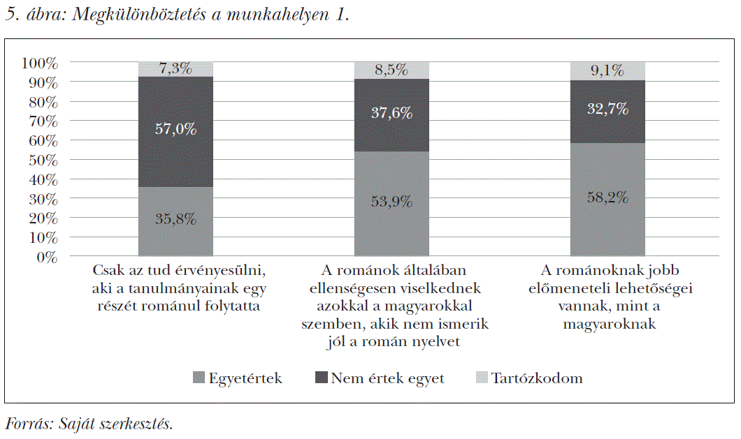 A válaszadók 57%-a nem ért egyet azzal, hogy Romániában csak azok tudnak érvényesülni, akik tanulmányaik legalább egy részét románul folytatták. A mintában szereplők valamivel több mint fele (53,8%) úgy véli, hogy a román munkatársak általában ellenségesen viselkednek azokkal a magyarokkal szemben, akik nem ismerik jól a román nyelvet. A válaszadók 58,2%-a úgy tartja, hogy a románoknak jobb előmeneteli lehetőségeik vannak, mint a magyaroknak(5. ábra).