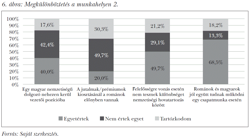Arra az állításra, hogy egy magyar nemzetiségű nehezen kerül vezetői pozícióba, nagyon eltérő válaszok érkeztek. Közel azonos azoknak az aránya, akik egyetértenek (40%) és akik nem értenek egyet (42,4%) ezzel az állítással. A mintában szereplők 20%-a értett egyet azzal, hogy a románok a jutalmak, prémiumok kiosztásánál előnyben részesülnek. A válaszadók körülbelül fele szerint (49,7%) ez nem jellemző. Szintén 49,7% úgy véli, hogy a felelősségre vonás esetében nem tesznek különbséget románok és magyarok között. A felelősségre vonás mértéke egyenlőtlen a válaszadók körülbelül egyharmada szerint (6. ábra).