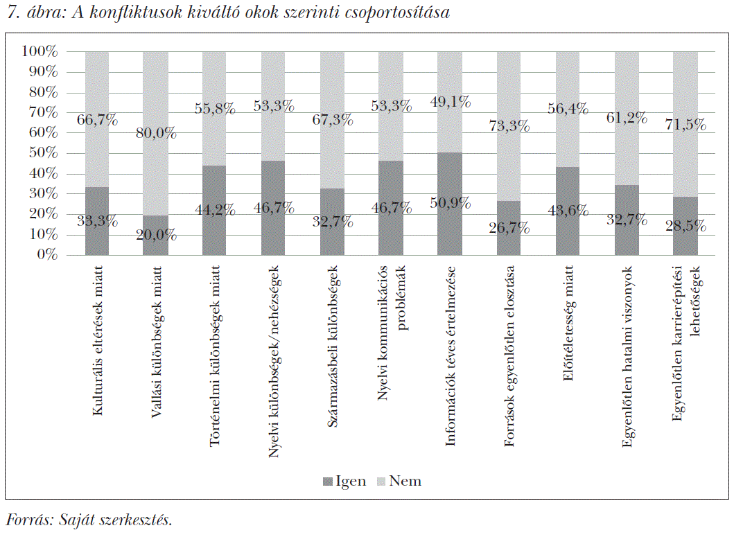 Növekvő sorrendbe helyezve megállapítható, hogy a legkevesebb munkahelyi konfliktust a vallási különbségek miatt tapasztalták a kitöltők (20%). Erdélyben már évszázadok óta létezik a vallási sokszínűség (katolikusok, reformátusok, evangélikusok, unitáriusok, ortodoxok, zsidók) és az ezzel együtt kialakult vallási tolerancia. Ezt követi a források egyenlőtlen elosztásából származó összetűzés (26,7%), majd az egyenlőtlen karrierépítési lehetőségek (28,5%). Az egyenlőtlen hatalmi viszonyokból (32,7%), a származásbeli különbségekből (32,7%) és a kulturális eltérésekből (33,3%) adódóan körülbelül minden harmadik személy átélt már valamiféle összeütközést. Ennél jóval magasabb arányban fordult elő az előítéletesség (43,6%) és a történelmi különbségek (44,2%) által okozott konfrontálódás. Leggyakrabban a nyelvi különbségek, nehézségek (46,7%), a nyelvi kommunikációs problémák (46,7%), és feltehetően az ebből fakadó információk téves értelmezése (50,9%) vezet a munkahelyen belül az eltérő nemzetiséghez tartozók konfliktusaihoz.
