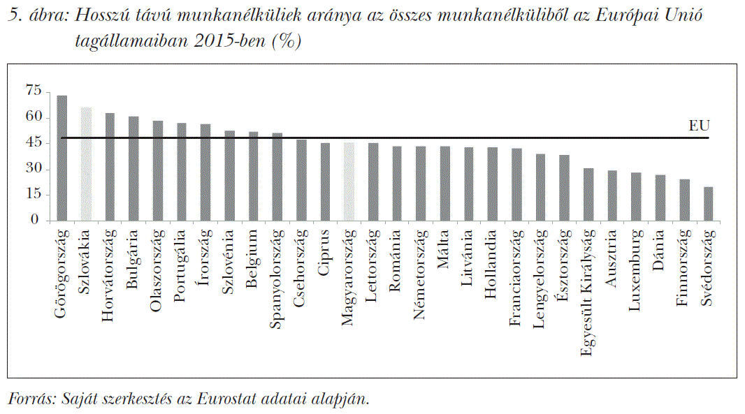 Az alacsony végzettséggel rendelkező, hosszú távú munkanélküliek európai viszonylatban is riasztóan magas aránya Szlovákia talán legégetőbb társadalmi problémája (4. és 5. ábra). A jelenlegi tényálláson mit sem segítettek a privatizációs folyamatok lezárulásával a külföldi tőkebeáramlás feltételeit megteremtő gazdasági reformok. A külföldi működő tőke területi megtelepedése és regionális elhelyezkedése korántsem volt egységes. A hármas határhoz közeli főváros és a vonzáskörébe tartozó járások, továbbá a délnyugati és északnyugati megyék kedvező földrajzi elhelyezkedése, fejlett infrastruktúrája és versenyképes, ugyanakkor a nyugat-európai munkaerőpiaci viszonyokhoz képest olcsó munkaereje mágnesként vonzották a nemzetközi nagyvállalatokat. A régiók párhuzamos fejlődése és felzárkózása kellő, nemzeti szintű gazdaságpolitikai intézkedések hiányában mind a mai napig utópikus elgondolás maradt. A hosszú távú munkanélküliségi ráta zsugorodása a gazdasági felzárkózás éveiben sem volt jelentős,24 és Szlovákia az EU tartós munkanélküliségi ranglétráján általában „dobogós helyen” végzett.