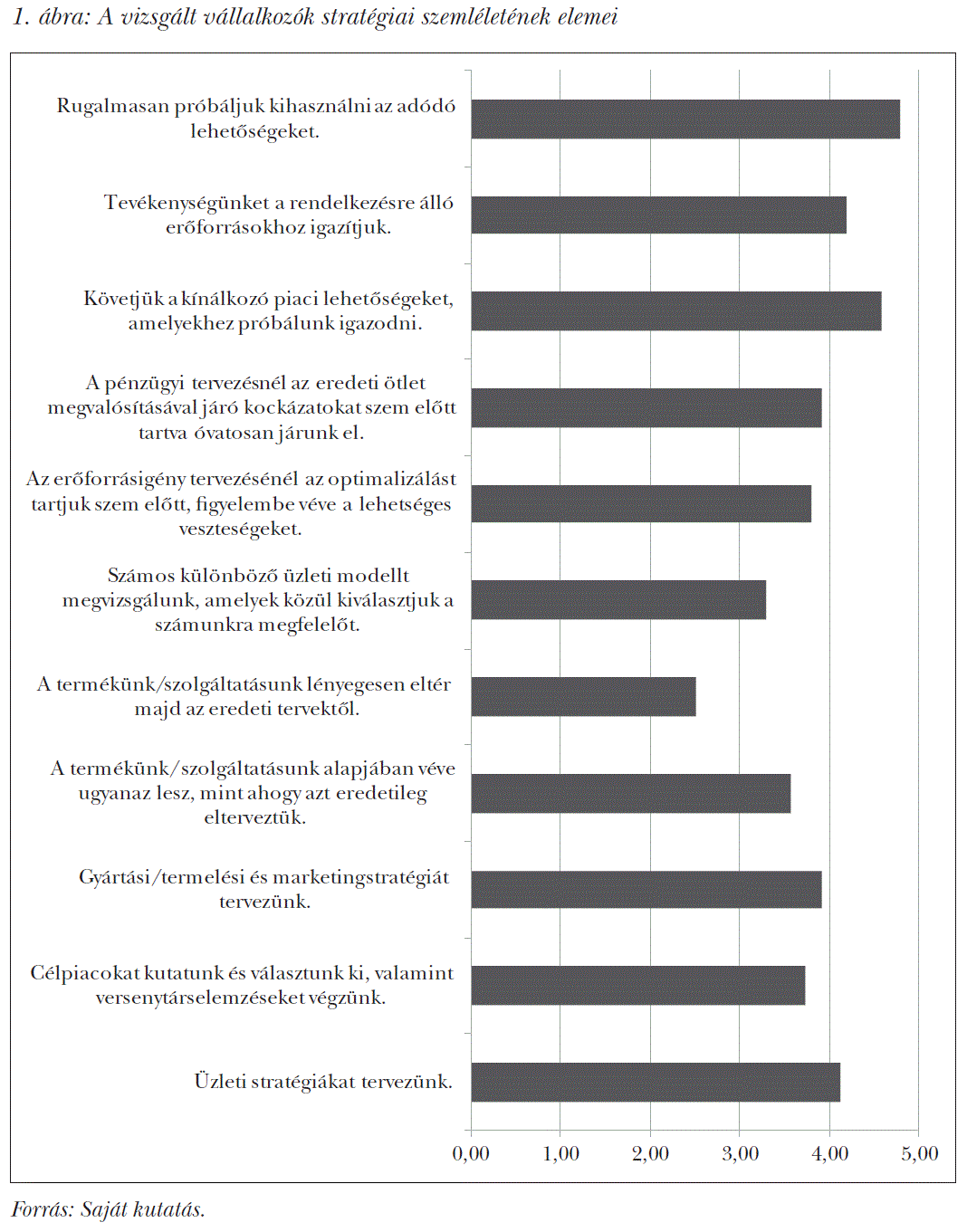Az 1. ábrán a vállalkozók stratégiai szemlélete vizsgálatának eredménye látható, amelyből leolvasható, hogy a megkérdezett vállalkozók nem elég rugalmasak, hajlamosak az eredeti elképzeléseikhez ragaszkodni, továbbá az üzleti modellek megvizsgálása, az erőforrásokkal való körültekintő gazdálkodás sem jellemző rájuk, ugyanakkor saját magukat – ennek ellenére – rugalmasnak, alaposnak tartják.