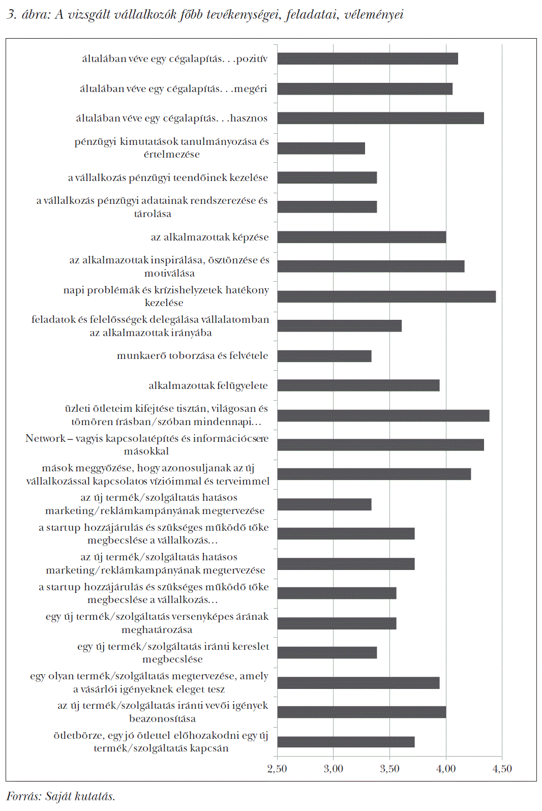 A mélyinterjúk során is kiemelésre került az oktatás szerepe a szociális tőke felhalmozásának folyamatában. Emellett természetesen az üzleti ötlet támogatja leginkább a vállalkozóvá válás folyamatát. A partner megtalálása szoros kapcsolatban áll a networkinggel, a kapcsolati tőkével. A vállalkozókkal lezajlott mélyinterjúk során is említésre került a gyakorlatorientált képzés, amelyben a gyakorló vállalkozóknak szánnának szerepet a megkérdezett interjúalanyok. Ezzel a gyakorlat, akár például esettanulmányok formájában is, bevihető az oktatásba. A vezetői feladatok ellátása kapcsán kérdőívünk a marketing, a pénzügyi, a HR-, a menedzsmentismeretek fontosságát tudakolta. A 3. ábrán látható, hogy a kérdőívet kitöltő vállalkozók minden nehézség ellenére hasznosnak, pozitívnak ítélik a cégalapítást. A vállalkozó személyiség ezeket a nehézségeket kihívásnak tekinti, nem akadálynak. Az adódó lehetőségek rugalmas kihasználására törekednek, a „félig üres pohár” szemlélet helyett a „félig tele pohár” szemlélettel rendelkeznek.