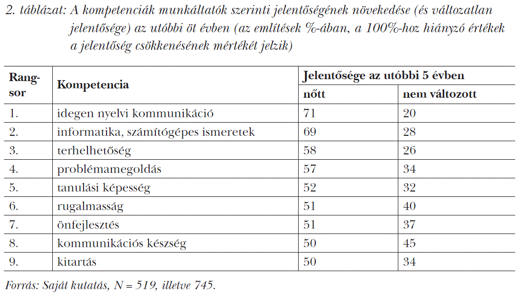 Itt fontosnak tartjuk arra is felhívni a figyelmet, hogy a jövőben törekedni kell a munkáltatók által a növekedett jelentőségű kompetenciák kialakítására az oktatás, a képzés során.
