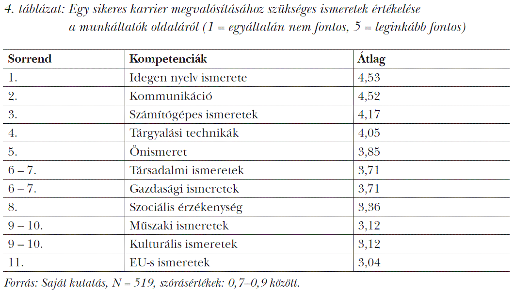 A válaszok szerint a legkisebb szerepet egy jó karrier megvalósításában jelenleg az EU-hoz kötődő ismeretek adják a kulturális és műszaki ismeretekkel együtt. A munkáltatók ez irányú véleményeit a 4. táblázat összesíti.