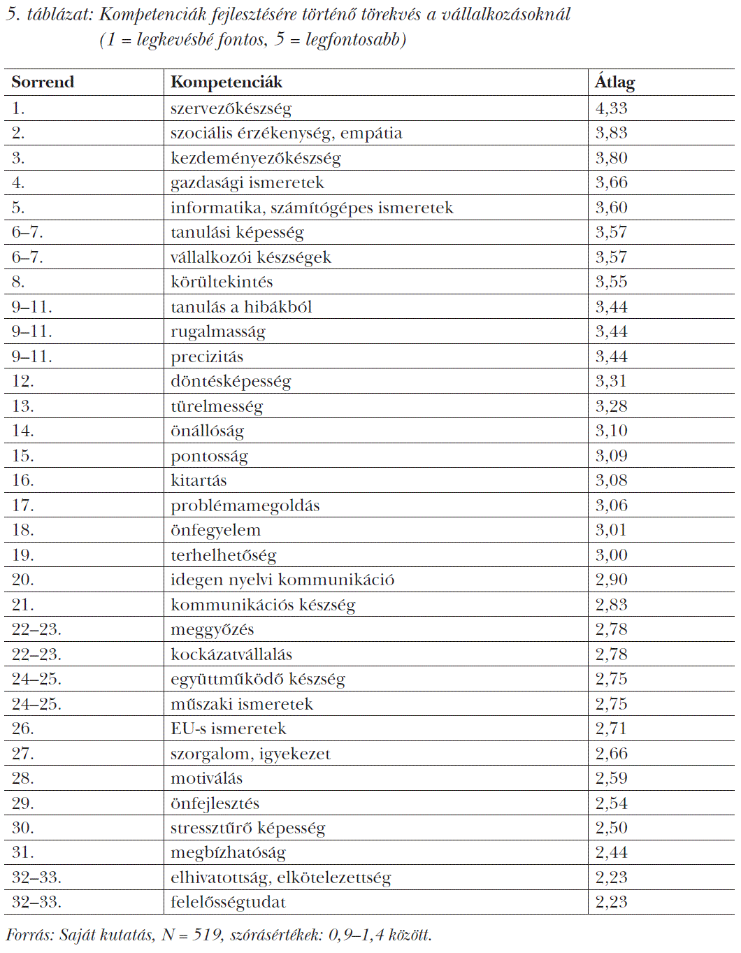 Vizsgáltuk azt is, hogy melyek azok a kompetenciák, amelyeknek fejlesztésére nagy hangsúlyt fektetnek a munkaadók. Ismét megerősítést nyert az az állítás, hogy a kompetenciák szerepe vitathatatlanul fontos, ezért fejlesztésükre tudatosan törekedni kell, és amennyiben mód és lehetőség nyílik rá, intézményesített keretek között történjék meg a fejlesztés. Erre vonatkozó vizsgálatunk során a munkáltatóktól a kérdőívünkön adatokat nyertünk arra, hogy mi a véleményük arról, a saját munkahelyükön milyen mértékű az általunk vizsgált kompetenciák fejlesztésére való törekvés. Ennek számszerűsített értékét az 5. táblázat mutatja.