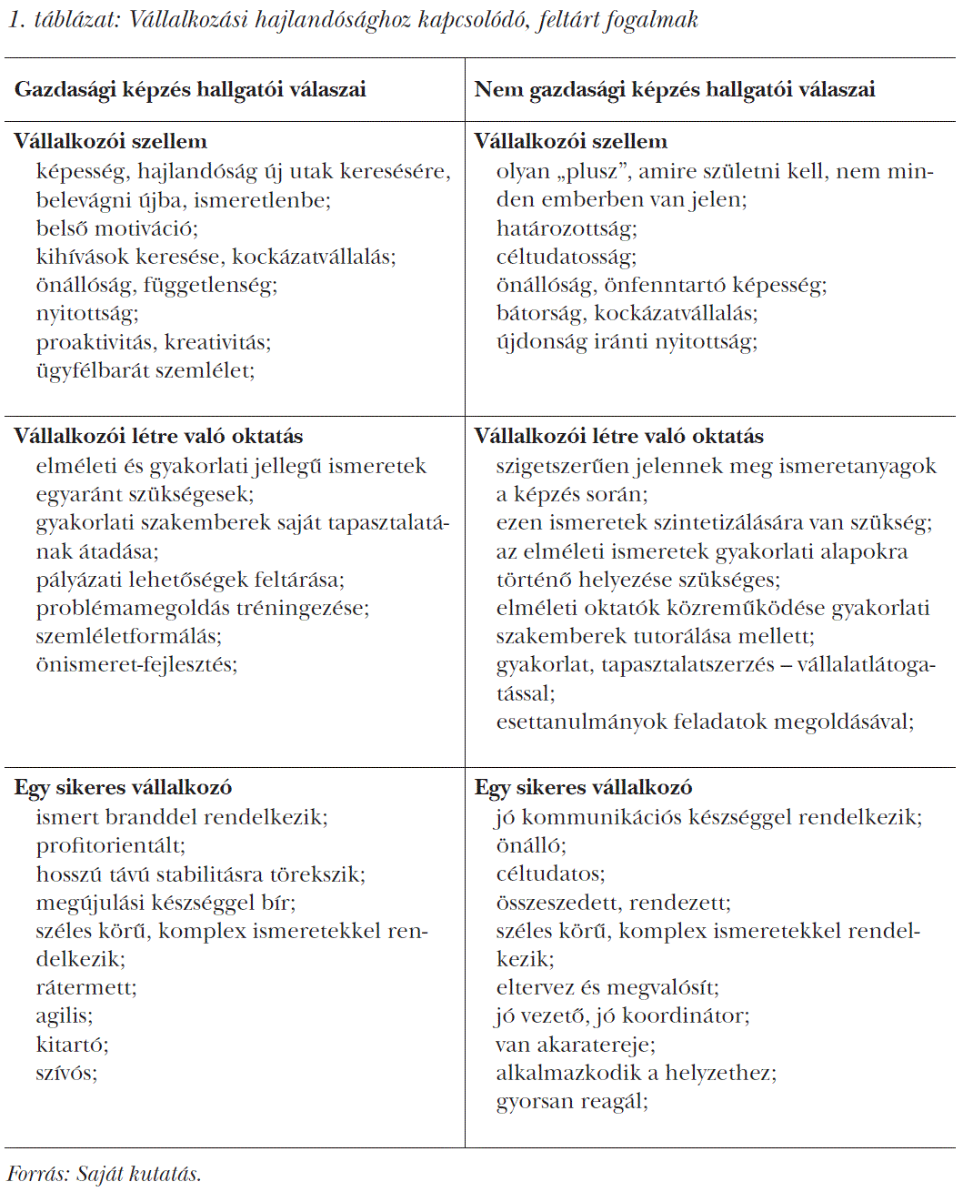 A hallgatóknak a vizsgálataink során feltárt vállalkozási hajlandóságához kapcsolódó fogalmait az 1. táblázatban ismertetjük, a válaszadók által társított jellemzőkkel. Ezek a fogalmak a vállalkozói szellem, a vállalkozói létre való oktatás, a sikeres vállalkozó.