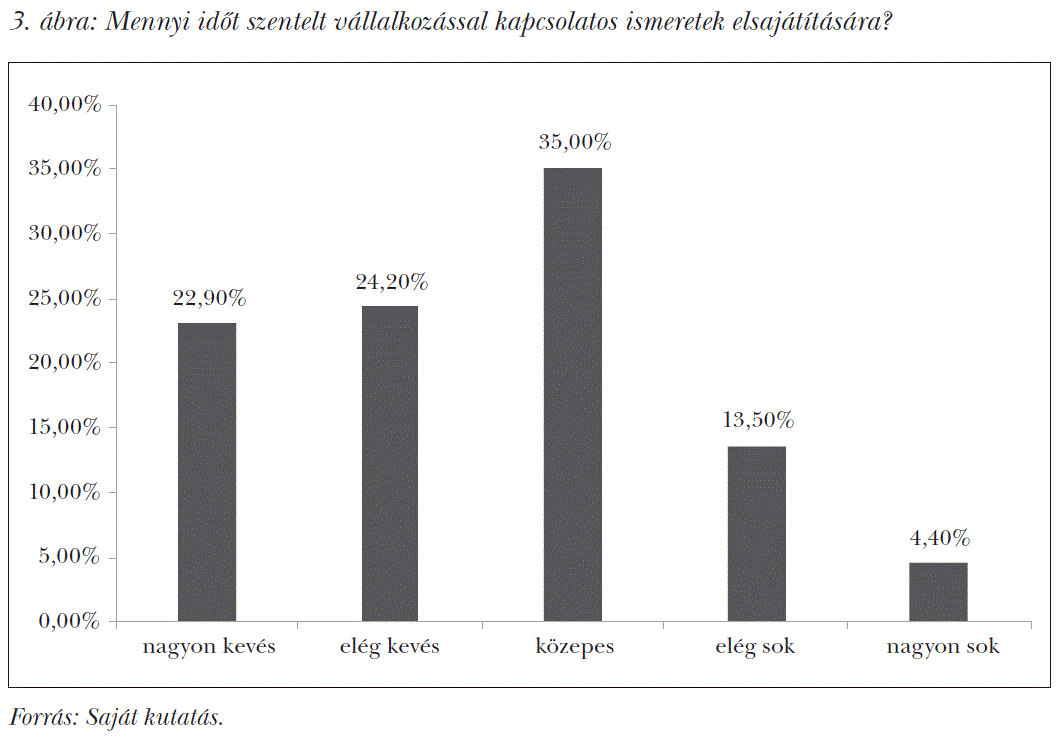 Az eredményekből szintén kiderül, hogy a megkérdezett hallgatók közel fele (47,2%-a) a tanulmányai alatt nagyon kevés vagy elég kevés időt fordított vállalkozással kapcsolatos ismeretek elsajátítására. Ez feltehetőleg a tantárgyi struktúrák sajátosságaira vezethető vissza. Itt szeretnénk felhívni a figyelmet arra, hogy tanulmányonként a hangsúlyok eltérőek lehetnek, ugyanakkor legyen szó gazdasági, műszaki vagy természettudományi területekről, a szakmába vágó vállalkozási profil nem elképzelhetetlen. Szükséges lehet tanulmányoktól függetlenül, a vállalkozással összefüggő ismeretek elsajátítását célzó kurzusok számának emelése, vagy az ilyen jellegű tantárgyak felvételi lehetőségének biztosítása.