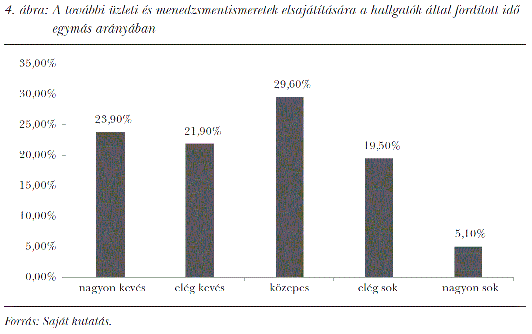 Megvizsgáltuk azt is, hogy mennyi időt (saját véleményük és megítélésük szerint a nagyon kevéstől az elég kevésen, a közepesen és az elég sokon keresztül a nagyon sokig tartó ötfokú skálán értékelve) szenteltek a válaszadók vállalkozással kapcsolatos (pl. üzleti terv, cégalapítás, kisvállalkozások pénzügyei stb.) ismeretek elsajátítására. Az eredményeket a 3. ábra mutatja be, amely alapján elmondhatjuk, hogy a válaszadók jellemzően kevés időt szántak vállalkozással kapcsolatos ismeretek elsajátítására, és összesen 17,90%-a jelölte, hogy elég sok vagy nagyon sok időt. Hasonló eredményeket kaptunk a más üzleti és menedzsmentismeretek (pl. menedzsment, pénzügy, marketing stb.) elsajátítására vonatkozó kérdésre (4. ábra). Összegzésként elmondhatjuk, hogy mindkét kérdés esetében a leggyakoribb válasz a „közepes” volt.