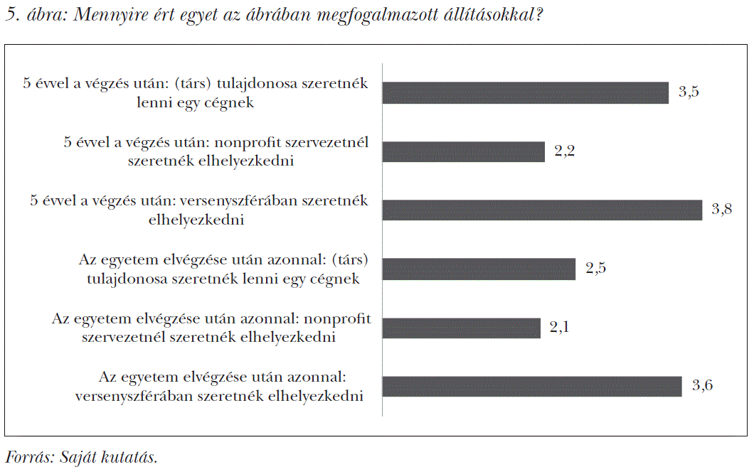 A továbbiakban a válaszadóknak az elhelyezkedésre vonatkozó állításokkal kapcsolatban kellett véleményt alkotniuk. Az egyes állításokat egy 1-től 5-ig terjedő skálán értékelhették annak megfelelően, hogy milyen mértékben (1 = egyáltalán nem; 5 = teljes mértékben) értenek egyet az állításokban megfogalmazottakkal. Az eredményeket az 5. ábrán olvashatjuk, ami alapján elmondhatjuk, hogy a válaszadók a diploma megszerzése után szívesebben helyezkednének el alkalmazottként a versenyszférában, mint hogy vállalkozóként dolgozzanak, ugyanakkor az „5 évvel a végzés után: (társ) tulajdonosa szeretnék lenni egy cégnek” állítással is egyetértenek a válaszadók.