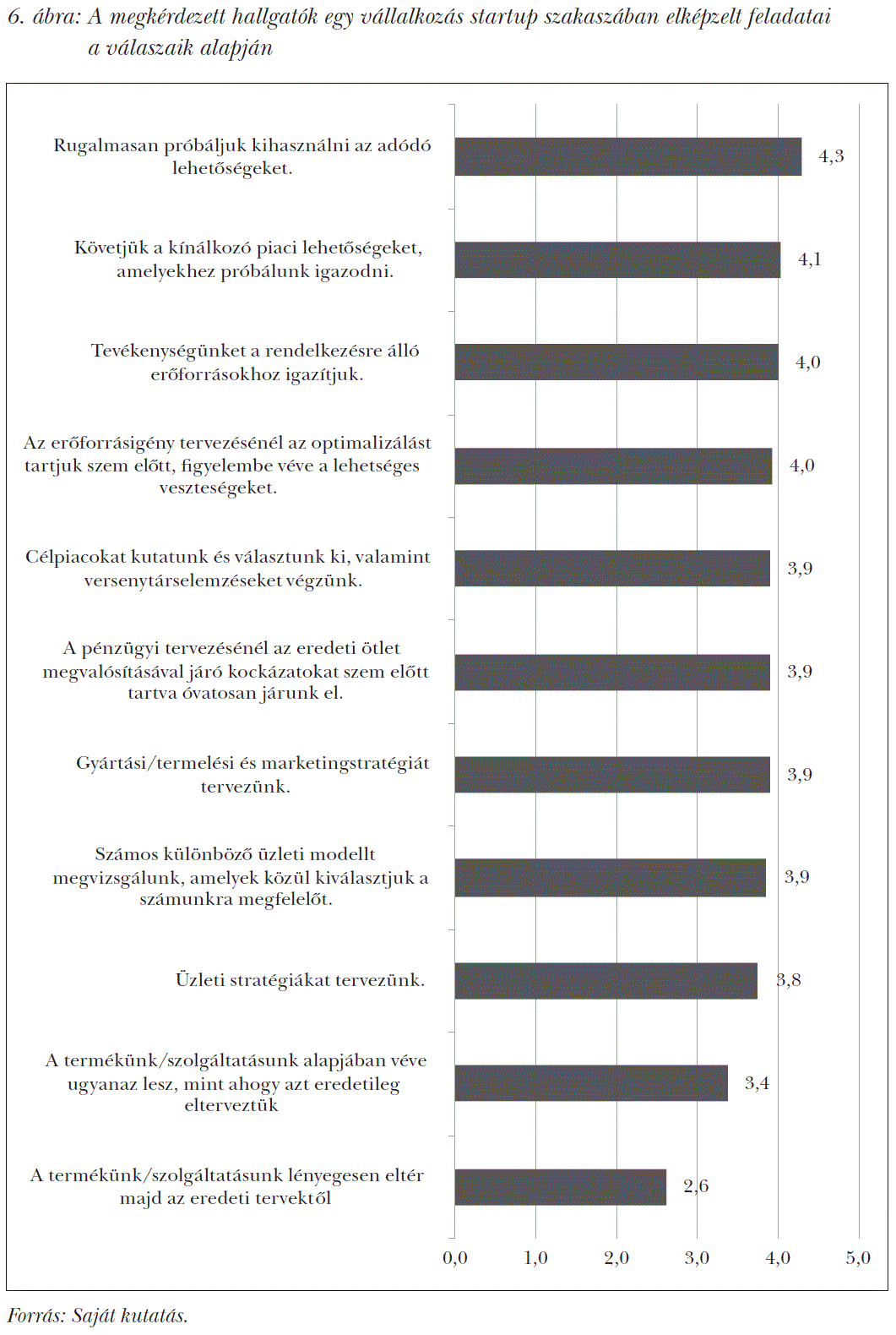 A továbbiakban arra kértük a kérdőív kitöltőit, hogy képzeljék el magukat egy vállalkozói csapat tagjaként, és jelöljék azt, hogy mennyire értenek egyet a 6. ábrában bemutatott állításokkal egy új vállalkozás startup (kezdeti) fázisával kapcsolatban. Az egyetértésüket egy 1-től 5-ig terjedő skálán tudták kifejezni.
