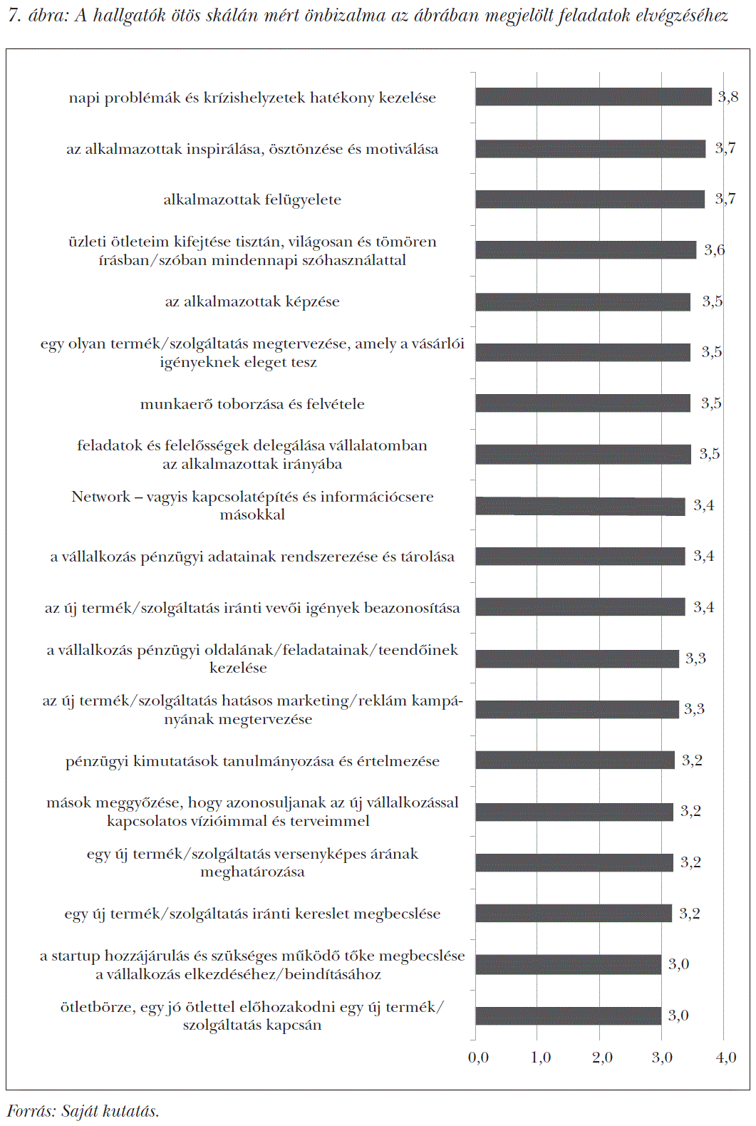 Az előbbiek után megvizsgáltuk, hogy a hallgatók képviselőinek mennyi önbizalmuk van, mennyire magabiztosak a következőkben, a 7. ábrában bemutatott (a vállalkozás működtetése során felmerülő) feladatok ellátásában, és az arra adott hallgatói válaszok átlagértékeit. Az egyes feladatokat egy 1-től 5-ig terjedő skálán értékelhették a válaszadók, ahol az 1 jelölte, hogy legkevésbé tudja és 5 a leginkább tudja kategóriát. Érdekes az a tény, hogy az egyes feladatok esetében mért eredmények egyik esetben sem vesznek fel 3 alatti átlagértéket.