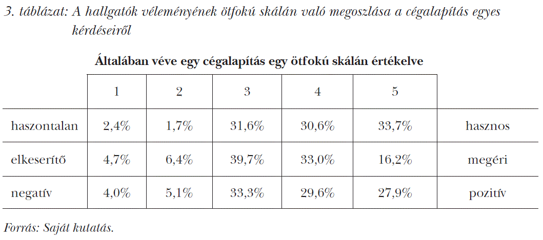 Végezetül megvizsgáltuk, hogy általában miként vélekednek a válaszadók a cégalapításról. A hallgatók cégalapításhoz való viszonyulását egy szemantikus differenciál jellegű skálán mértük. Az eredmények alapján elmondhatjuk, hogy a válaszadók a cégalapítást jellemzően hasznosnak tartják, úgy érzik, hogy azt megéri megtenni, és pozitív tevékenységnek gondolják. Jól jellemzik ezt a 3. táblázatban közölt adatok.