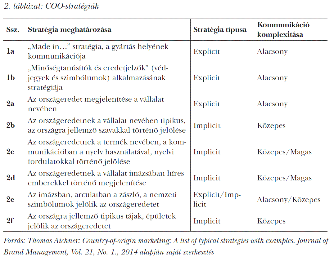 Napjainkban a vállalatok a versenyelőny megszerzése érdekében termékeik vagy nyújtott szolgáltatásaik esetében országeredet-imázst alkalmazhatnak a marketing- (rész)stratégiáik kialakítása során. Aichner tanulmányában elkülönít jogilag szabályo- zott (1) és nem szabályozott (2) stratégiatípusokat.44 Aichner összefoglalja és meg- határozza azt is, hogy a jelzett stratégiák a vállalatok perspektívájából implicit vagy explicit stratégiák, illetve a kommunikációs fókuszukat tekintve mennyire tekinthetők komplexnek (2. táblázat).