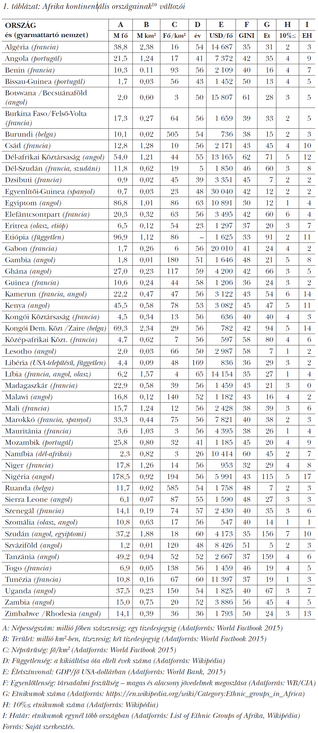 Az 1. táblázat változói olyan tájékoztató jellegű adatokat is tartalmaznak, mint az ország népességszáma (A) és területi kiterjedése (B). A minősítésben viszont csak az ebből a kettőből generált népsűrűség (C) szerepel, feltételezve, hogy a nagyobb népsűrűség egy etnikailag heterogén, multikulturális társadalom esetén több feszültséghez vezethet, mint egy ritkán lakott területen. A demográfiai változó után a politikai adatok területén a sok országban kaotikus politikai helyzet és az ezzel járó adathiány miatt, a függetlenség tényleges de facto elérése óta eltelt évek száma szerepel (D), azt feltételezve, hogy a hosszabb idő erősebb konszolidációt eredményez. (Sajnos éppen a gyakorlatilag több mint ezer éve független etióp állam belső kohéziója nem igazolja ezt vissza, ugyanakkor a legfiatalabb afrikai államok, pl. Dél-Szudán vagy Eritrea létrejötte fegyveres konfliktusokká fajult ellentétek eredménye.)