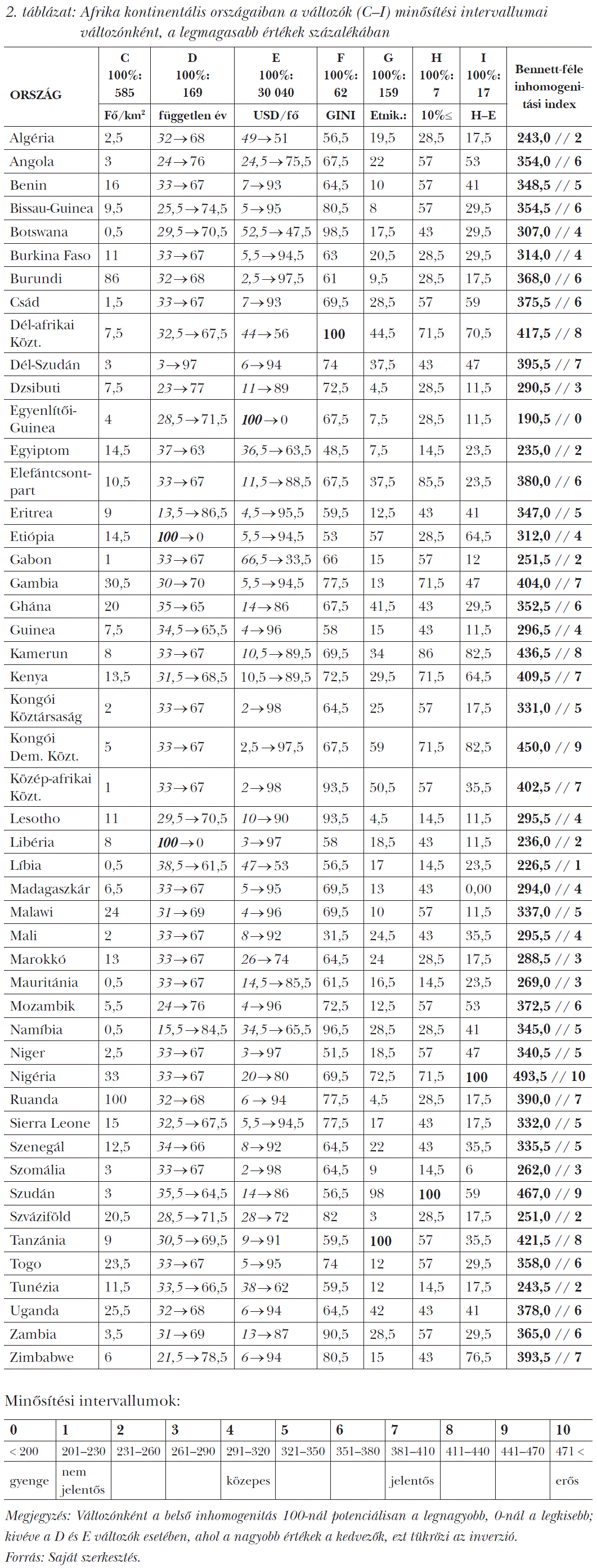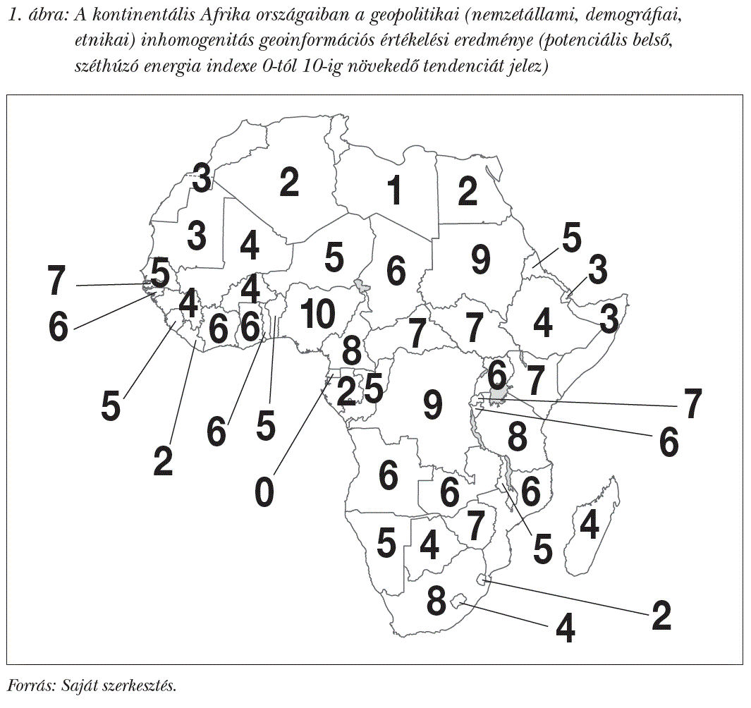 A szavannai és az esőerdei Fekete-Afrika országaiban a belső, társadalmi inhomogenitás magas-közepes, illetve jelentős, eltekintve egy-két kivételtől (Libéria: 2; Egyenlítői-Guinea: 0), ahol történelmi-politikai ok vagy népirtó, véres diktatúra tette homogénné az országokat. Az Afrika-prognózis nem sok jóval biztat. Ez a vizsgálat is lényegében támogatja George Friedman feltételezését,11 miszerint a nemzetállamok kialakulása évtizedes, ha nem évszázados háborúkat feltételez, és Afrika még csak az elején jár ennek a folyamatnak. A kontinens szerencsétlensége, hogy ez olyan korban következik be, amikor a nyugati technológia és a fegyverek sokszorosan „hatékonyabbak”, mint a középkorban, amikor Európa formálódott. Ennek megfelelően a népirtó háborúk is sokkal véresebbek, és a népességnövekedési rátát tekintve, a szenvedő alanyok számában sincs hiány. Az afrikai kontinens balsorsát tetézi, hogy ezeket a törzsi-nemzeti háborúkat a fegyvereladási érdek is generálja és felgyorsítja. Az újkori afrikai népvándorlást pedig növeli, hogy azt a globális felmelegedés okozta szárazság, éhínség és túlnépesedés mellett arc nélküli gazdasági aktorok – geopolitikai céltól vezérelve – is inicializálják.