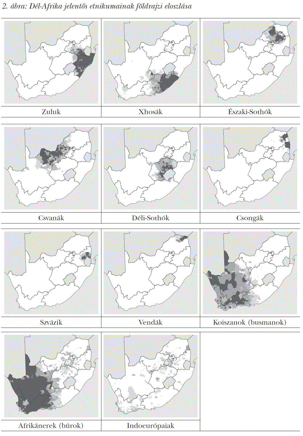 Utazási szempontból Dél-Afrika frekventált nagyvárosai – mint europanizált települések – biztonságosnak számítanak, mégis, meglepő módon, az ország belső inhomogenitására jelentős (8-as) minősítés adódott. Az országot 71 etnikum lakja, akik közül 12 nép tagjai más, környező országokban is élnek. Az ország európai mintára kialakított kétkamarás törvényhozása kvázi föderális viszonyokat teremtve próbálja meg ezt a nemzetiségi sokszínűséget kezelni – egyelőre. A 2. ábra szemlélteti a nagyobb dél-afrikai etnikumok térbeli eloszlását.