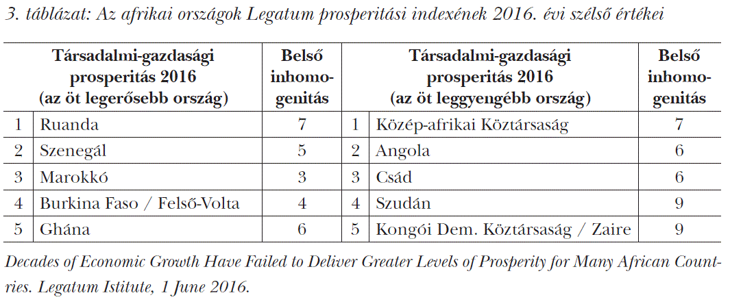 A Legatum Intézet évente elkészíti a Föld országainak prosperitási indexét, amely a társadalom belső „egészségét” a szabadságjogok érvényesülése szempontjából minősíti. Talán nem érdektelen az összefoglalásban bemutatni, hogy a prosperitás és a jelen írásban megközelíteni kívánt belső inhomogenitás hogyan viszonyul egymáshoz; bár a prosperitási index nem vesz figyelembe etnikai tényezőket.12 A 3. táblázat az afrikai országok társadalmi-gazdasági Legatum prosperitási indexének 2016. évi szélső értékeit mutatja, ahol az éppen jól teljesítő országok belső inhomogenitása (átlagosan 5,0) közepes, míg az alulteljesítőké erős inhomogenitásnak (átlagosan 7,2) feleltethető meg.