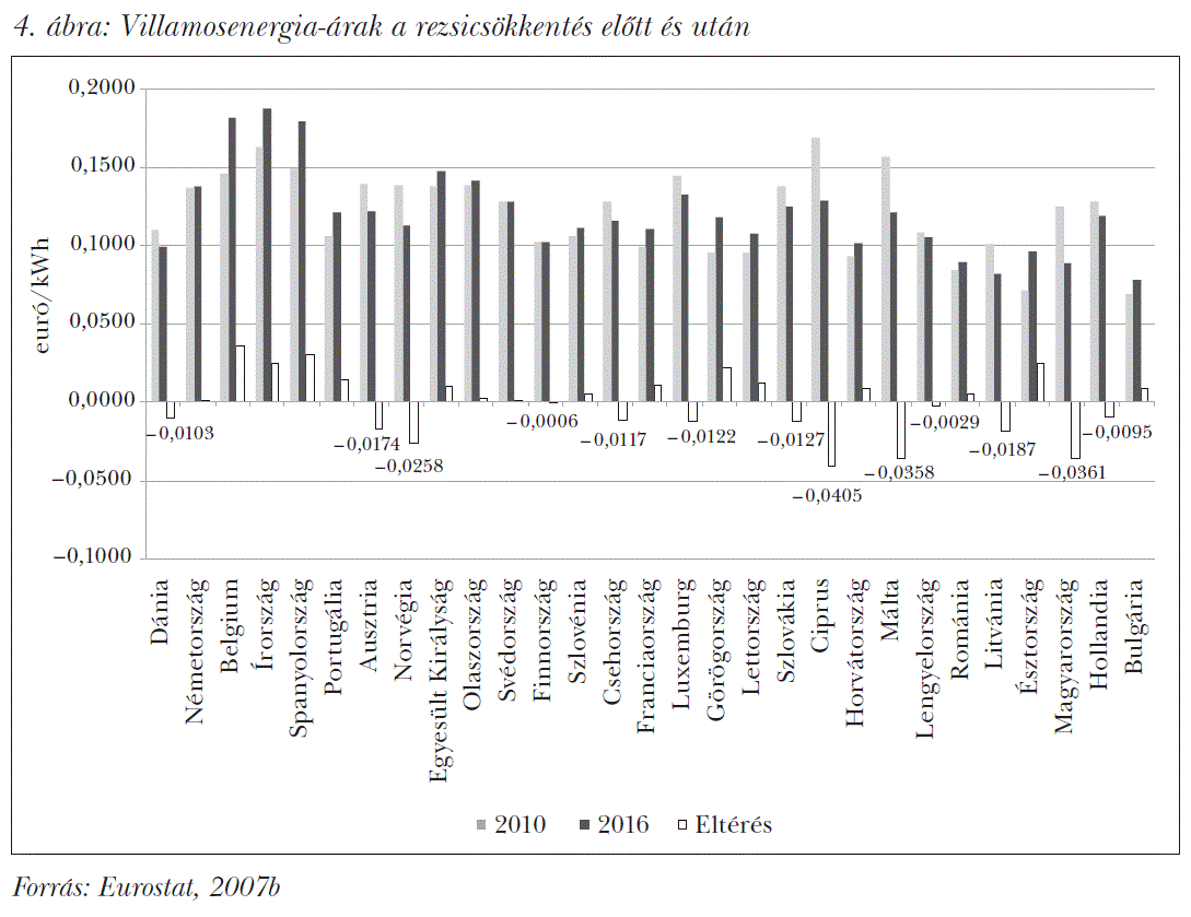 Kaja Kallas észt képviselő szerint nekik már van tapasztalatuk az EU által javasolt rendszerről, amely véleménye szerint náluk a rezsi csökkenését eredményezte (Hír TV, 2017). Kétségtelen, hogy európai összehasonlításban az észt villamosenergia-ár 2016-ban a harmadik legalacsonyabb volt, ugyanakkor 2010-ben még a második legalacsonyabb. Tehát valójában a pozíciójuk nem javult, hanem romlott, ezzel szemben Magyarországé jelentősen javult. A 4. ábrán jól látható, mely országokban csökkentek az árak, és milyen mértékben.