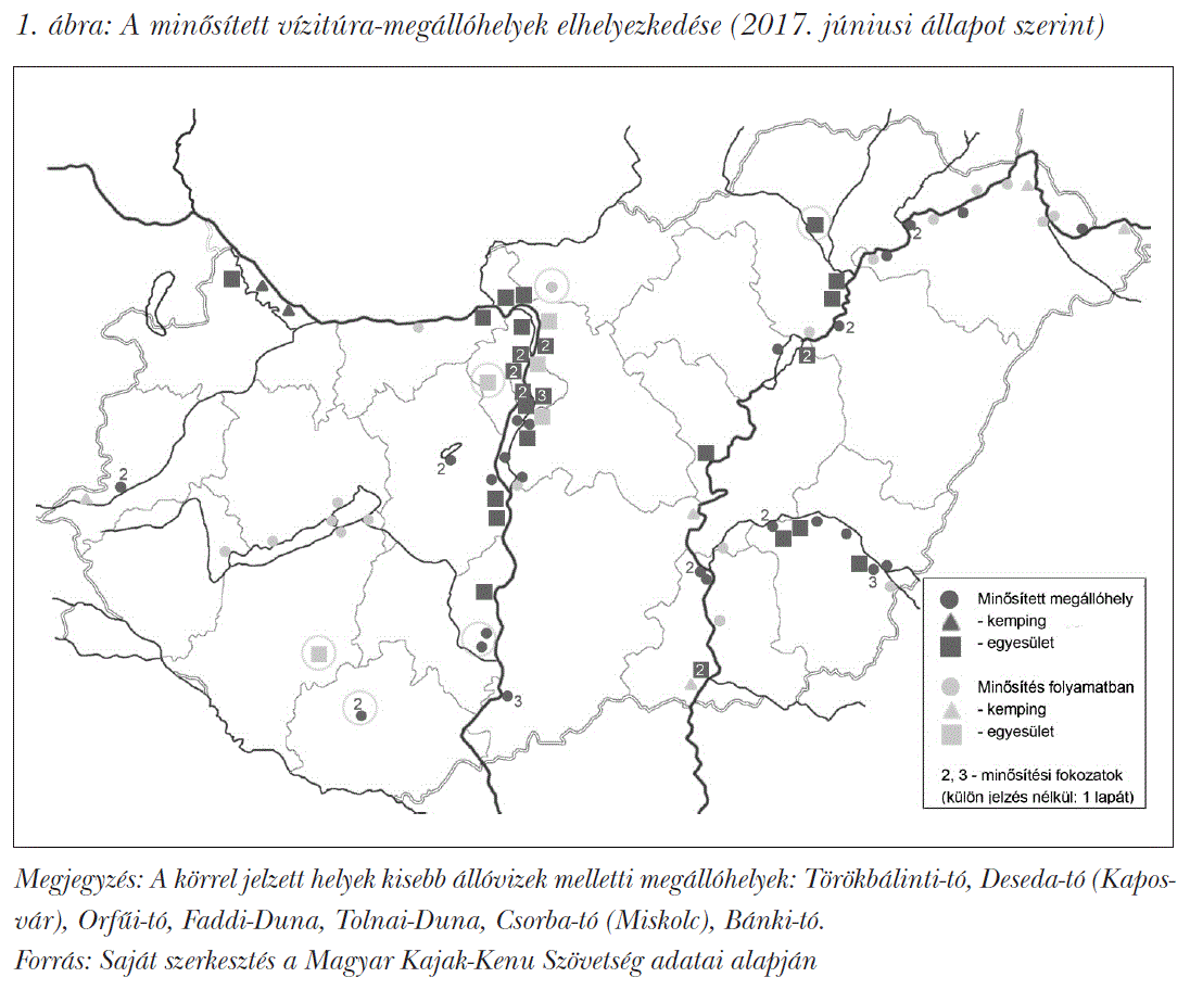 Bár az eddigi minősítések, illetve minősítési szándékok még csak a kezdeti érdeklődésnek tekinthetők, több jellemző már most megfigyelhető. A szolgáltatók területi elhelyezkedése alapján látható, hogy azok száma, illetve sűrűsége nem esik egybe a víziturizmus forgalmával, bár bizonyos párhuzamok tapasztalhatók. A szolgáltatók részéről a legnagyobb az érdeklődés a Felső-Tisza-vidéken, illetve a Közép-Tisza-vidék felső szakaszán, a Körösök mentén és a Ráckevei-Duna-ágban, miközben több jelentős vízitúrázó célterületen (a Rába, az Alsó-Duna, a Bodrog, a Hernád és a Sajó mentén) egyelőre egyáltalán nincs minősített túramegállóhely ( 1. ábra). Figyelemre méltó, hogy a folyó menti területekhez képest jobb infrastrukturális adottságokkal rendelkező Balaton-parton növekszik a bejelentkezett szolgáltatók száma, mivel ebben a térségben – a már eddig is kialakult szolgáltatási kínálat révén – szinte semmiféle fejlesztési igénnyel nem jár a minősítés megszerzése. Ennek ellenére a vízitúrázás – a rendelkezésre álló, leginkább elterjedt és hozzáférhető sporteszközök korlátai révén – elsősorban folyóvizeken lehetséges, így bizonytalanok lehetünk abban, vajon a kínálati oldalon elérhető fejlett infrastruktúra képes lesz-e ellensúlyozni a vízitúrázás mindeddig alapvetőnek tekintett vonzerőit és egyéb feltételeit.