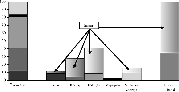 1. ábra: Az országos energiahordozó-mérleg %-ban az importrészarány feltüntetésével, 2003