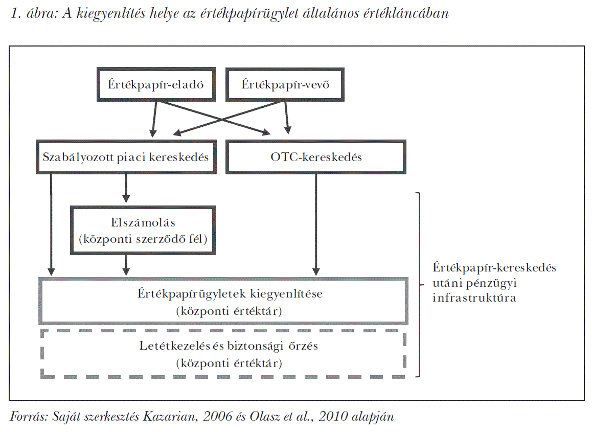 A központi értéktár definícióját az Európai Unióban az úgynevezett CSD-rendelet1 határozza meg. A CSD az angol Central Securities Depository rövidítésből ered. A rendelet alapján a központi értéktár az értékpapír-kiegyenlítési rendszert működtető jogi személy, amely központi számlavezetési szolgáltatást nyújt, és nyilvántartásba veszi az újonnan kibocsátott értékpapírokat. A kiegyenlítési2 tevékenység a klasszikus értelemben vett értékpapír-kereskedés utáni tevékenység. Helyét az értékpapírügylet általános értékláncában az 1. ábra mutatja.