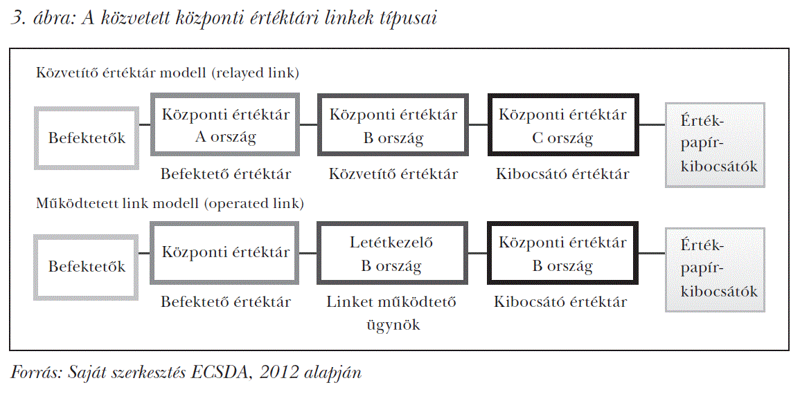 Az értéktárak közötti linkek több típusa is kialakult. Közvetlen linknek nevezzük, amikor a két központi értéktár közvetlenül kapcsolódik egymáshoz, ahogy azt például a 2. ábra is mutatja. A közvetett linkek esetében egy vagy több letétkezelő bank, illetve központi értéktár kapcsolódik a láncba (3. ábra).