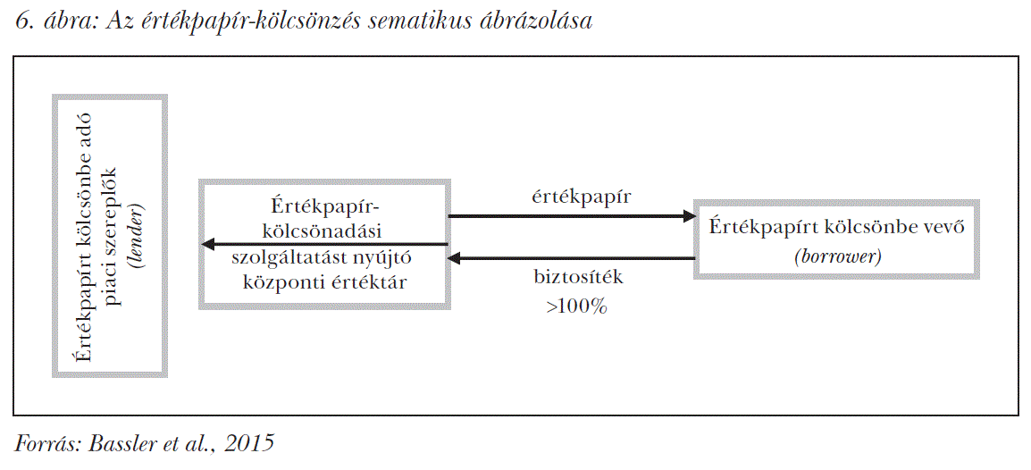 Az értékpapír-kölcsönzési tevékenység a központi értéktár szempontjából egyszerre jelent hitelkockázatot, valamint az értékpapír-elszámolási és -kiegyenlítési rendszer szempontjából kockázatmérséklési eszközt. Ha egy központi értéktár értékpapír-kölcsönzési szolgáltatást nyújt, az gyakorlatilag azt jelenti, hogy a nála lévő – erre a célra használható – értékpapírokat kölcsönadja a piaci szereplőknek díj ellenében. Ha a piaci szereplő azért kéri kölcsön ezt a papírt, mert másként nem tudná teljesíteni szállítási kötelezettségét, akkor az értékpapír-kölcsönzés rendszerkockázat-csökkentési előnye érvényesül, így ugyanis nem történik nemteljesítés,14 illetve a nemteljesítés elkerülése okán nemteljesítési lánc (fertőzési hatás) sem alakul ki. Az értékpapír-kölcsönzés kapcsán a hitelkockázat ugyanakkor abban testesül meg, hogy fennáll a lehetősége annak, hogy az értékpapírt kölcsönbe vevő nem tudja visszaadni az értékpapírokat azok esedékességekor a kölcsönadónak. Ezt kiküszöbölendő, az értékpapír-kölcsönzés sohasem fedezetlen tevékenység, vagyis az értékpapírért cserébe a kölcsönbe vevő minden esetben biztosítékot ad. A biztosíték értéke az ügylet megkötésekor mindig magasabb, mint a kölcsönbe vett értékpapír értéke (6. ábra).