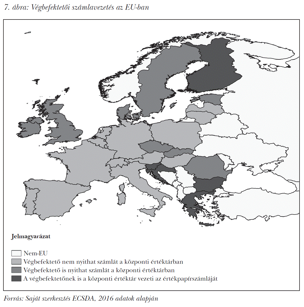 Ahogy korábban arról érintőlegesen volt szó, a központi értéktárak két modellje alakult ki az értékpapírszámla-vezetés szempontjából. Az egyik modellben a központi értéktár nem vezet számlát végbefektetők (pl. magánszemélyek) részére, a másik modellben pedig bárki nyithat értékpapírszámlát a központi értéktárban. Az ECSDA (2016) adatai alapján az Európai Unióban jelenleg 14 értéktárnál lehet végbefektetőknek is számlát nyitni (7. ábra).