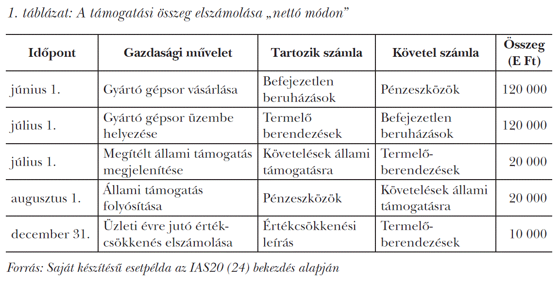 Nézzük meg a standard előírásainak értelmezését az eszközbeszerzéshez kapcsolódó állami támogatások elszámolása vonatkozásában egy esetpéldán keresztül. Tételezzük fel, hogy egy vállalkozás 2017. június 1-jén megvásárolt egy gyártó gépsort 120 millió Ft vételáron. A beruházás megvalósításához pályázat útján 20 millió Ft állami támogatást kapott. A támogatási összeget az állam 2017. augusztus 1-jén folyósította. A gyártó gépsor üzembe helyezésének, aktiválásának időpontja 2017. július 1. Az eszköz hasznos élettartama 5 év, az értékcsökkenést lineáris módszerrel számolják el a hasznos élettartam alatt. A támogatás összegének elszámolása történhet „nettó módon” az eszköz bekerülési értékével (1. táblázat), illetve bruttó módon (2. táblázat).
