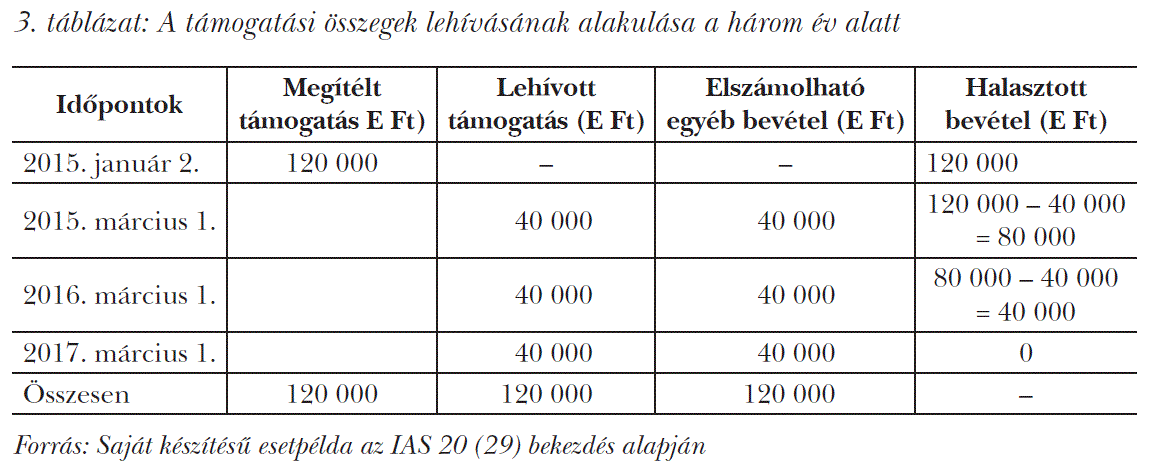 Nézzük meg a standard előírásainak értelmezését a jövedelemhez kapcsolódó állami támogatások elszámolása vonatkozásában egy esetpéldán keresztül. Tételezzük fel, hogy a vállalkozás 2015. január 2-án kutatás-fejlesztési tevékenységre 120 millió Ft állami támogatást kapott pályázati úton, állami határozattal. Az elnyert támogatási összeg három év alatt hívható le, egyenlő összegben, minden év március 1-jén. A támogatási szerződés szerint az összeg lehívásának feltétele minimum 20 személynek a projektben való foglalkoztatása. A vállalkozás a feltételeket teljesítette, a 2015. január 2-án kelt határozat szerint, a támogatási összegeket minden évben március 1-jén megkapta, és az időszak alatt az összegek számviteli elszámolása az 3. táblázatban foglaltak szerint megtörtént.
