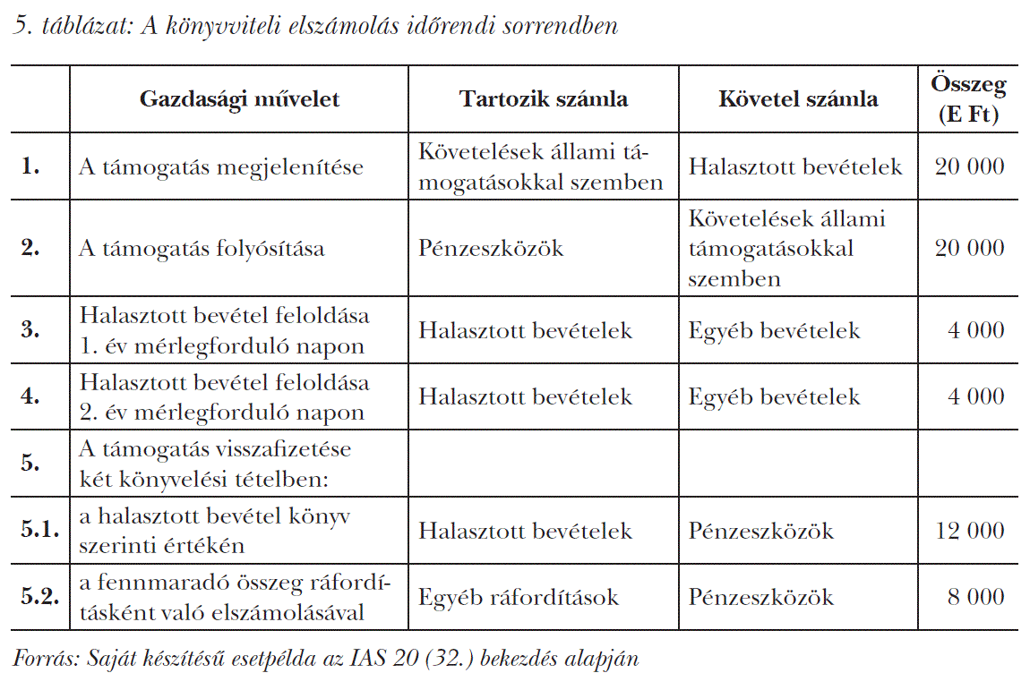 A jövedelemhez kapcsolódó támogatás visszafizetését először a támogatással kapcsolatban kimutatott elhatárolás könyv szerinti értékével szemben kell elszámolni. Ha a visszafizetés összege meghaladja az ilyen elhatárolás összegét, a fennmaradó összeget az eredmény terhére, ráfordításként kell elszámolni [IAS 20 (32) bekezdés]. Tételezzük fel, hogy a vállalkozás 20 millió Ft munkahelyteremtő állami támogatást kap, aminek feltétele legalább 20 munkahely létrehozása és öt éven keresztül való fenntartása. A vállalkozás az 1. és a 2. évben teljesíti a feltételeket, de a 3. évben a szerződésben kikötött feltételek már nem teljesülnek. A szerződés értelmében, a szerződéses feltételek nemteljesülése esetén, a támogatás teljes összegét vissza kell fizetni.