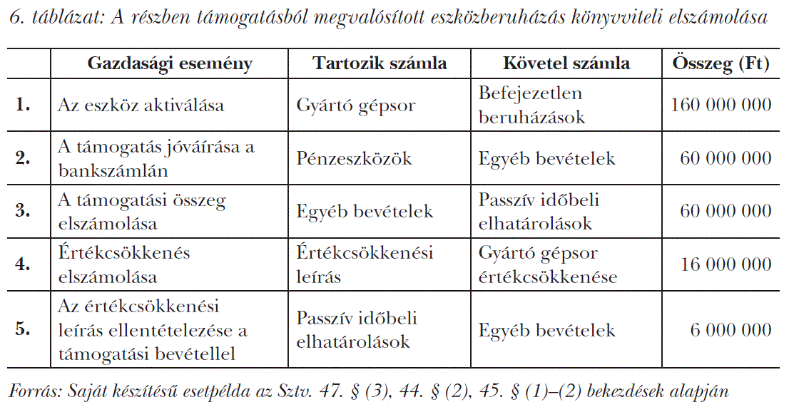 A számviteli törvény előírásai tételes előírást tartalmaznak az elszámolás módjára. A beruházáshoz kapcsolódó, véglegesen kapott támogatás összege nem csökkenti az eszköz bekerülési (beszerzési) értékét (Botka, 2016:24). A támogatás összegét a passzív időbeli elhatárolások között kell kimutatni addig, amíg a kapcsolódó költségek (ráfordítások) nem merülnek fel [Sztv. 44. § (2) és 45. § (1) és (2) bekezdések].