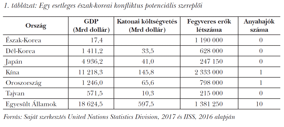 Egy eszkalálódó konfliktus ebben a térségben könnyen veszélyessé válhatna. Az 1. táblázatban láthatjuk egy Észak-Korea körül kibontakozó esetleges konfliktus potenciális résztvevőit, közvetlen érintettjeit. Nemcsak a világgazdaság három legnagyobb gazdasága szerepel a táblázatban, de két legerősebb atomhatalma (Egyesült Államok és Oroszország) és két legnagyobb katonai költségvetéssel rendelkező országa (Egyesült Államok és Kína) is, miközben Japán és Dél-Korea katonai kiadásai is az első tíz között vannak a világon, Oroszországé pedig a negyedik (IISS, 2016). Márpedig az eszkalációnak egy konfliktus esetén volna lehetősége, hiszen az észak-koreai kardcsörtetés miatt Kína mellett Dél-Korea és Japán is feszült, egy amerikai beavatkozásra reagálva pedig Kína akár Tajvanra, sőt a Fülöp-szigetekre is kiterjeszthetné a konfliktust.