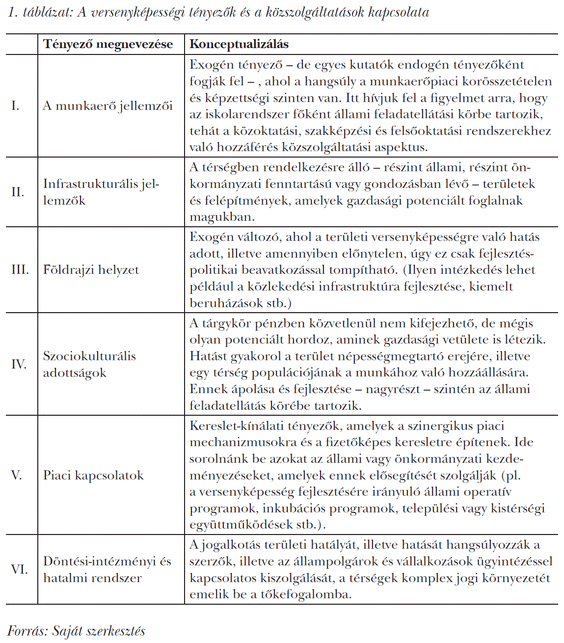 A regionális kutatások számos esetben próbálják összefogni azokat a szerteágazó és komplex tényezőket, amelyek vizsgálatba vonása révén a térségek versenyképessége mérhető. A területi tőke dimenzióinak hazai interpretációit vizsgálva (Jóna, 2013) látható, hogy a közjavak, illetve közszolgáltatások alacsony rivalizálás mellett vehetők igénybe, de az eredeti területitőke-modell (Camagni–Capello, 2009) nem tér ki a közjavak és a versenyképesség kapcsolatának elemzésére, viszont axiómaként is értelmezhető a közszolgáltatások hozzáférhetőségének és a lakónépesség versenyképességének kapcsolata. Ugyanis a térben koncentrálódó potenciál elszívja a perifériatérségekből a termelési tényezőket – amelyek közül leginkább mobil a humán erőforrás –, ami konzerválja az érintett területek gazdasági és humánpotenciáljának kedvezőtlen helyzetét. Ez törvényszerűen együtt jár a gazdaság szerkezetének tercierizálódásával, azonban települési szinten gondot okozhat a nagymértékű elvándorlás, de az is, hogy bizonyos néprétegek munkalehetőség, képzettség, kielégítő jövedelem és lehetőségek hiányában a hátrányos helyzetű területeken rekednek (Kovács, 2016).