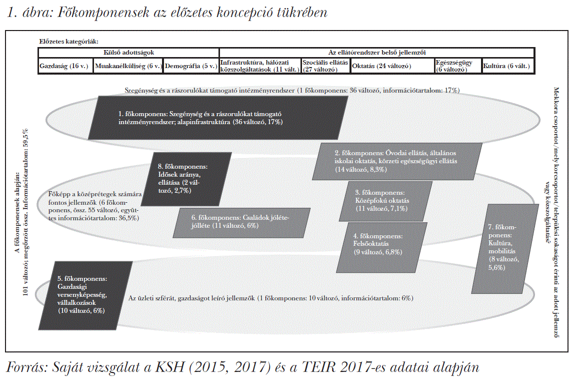 Az adatredukció tekintetében a főkomponens-elemzés bizonyult hatásosnak. A vizsgálat többszöri lefuttatása után és a nem megfelelően aggregálható mutatóktól lépésenként megszabadulva 101 megőrzött, 8 főkomponensre megfelelően illeszkedő változó maradt meg, és az így keletkezett főkomponensek az eredeti változók információtartalmának összesen 59,5%-át őrizték meg, aminek a magyarázóértékét elfogadtuk. A kialakult főkomponensek azonban nem elsősorban az előzetes, külső-belső tényezőket vagy ágazati tagozódást követték, hanem azok sokkal inkább függenek össze a településhierarchiával, illetve az adott jellemző vagy szolgáltatás által érintett korcsoport vagy gazdasági tevékenység adott településen való meglétével vagy hiányával. Például az oktatás ágazata három különböző főkomponensre „esett szét”: alapfokú oktatásra (amelybe bekerültek a körzeti szintű egészségügyi ellátások is), középfokú, valamint felsőoktatásra. Ez egyrészt következik a vizsgálat módjából, de egyben rávilágít a területi szemlélet szükségességére is. Ellenben a „Szegénység és a rászorulókat támogató intézményrendszer” főkomponens nagyban érinti a munkanélküliséggel kapcsolatos és demográfiai tényezőket, de számos infrastrukturális elemet és szinte a teljes szociális ellátást is felöleli (1. ábra).