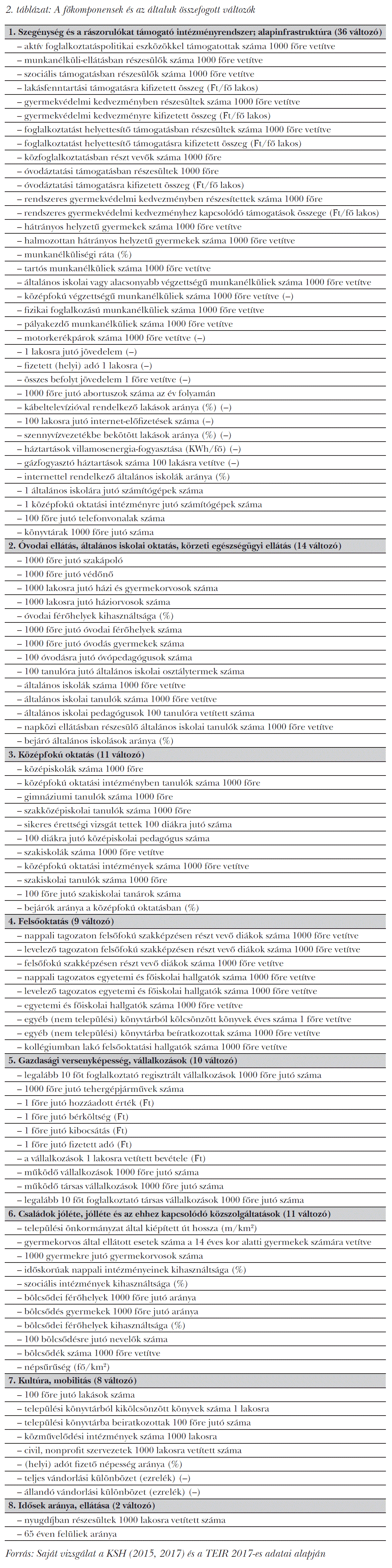Első körben 475, települési szinten is elérhető mutató felelt meg ennek a szempontnak. Mivel ez az adattömeg hatalmas, vagy képi megjelenítésre alkalmatlan, adatredukciós módszerre (faktor- vagy főkomponens-elemzésre) volt szükség (Székelyi–Barna, 2002). Így az egymással összefüggő mutatókból kisebb számú faktort nyerünk, amelyek alapján képesek leszünk a települési szintű adatok típusainak és ezzel együtt jellemző változóértékeinek a meghatározására, feltárására is a klaszteranalízis segítségével. Ha az alapvető problémákat és azok összefüggéseit ezzel a módszerrel feltártuk, véleményünk szerint akkor lesz lehetőségünk a továbbiakban ezek, illetve az adott település (majd térség) jellemzőit, a – jelen vizsgálat eredményében is tükröződő – településhierarchiát és az esetleges települések közötti feladatmegosztást (specializációt) is figyelembe véve, közszolgáltatás-fejlesztési javaslatok megfogalmazására.