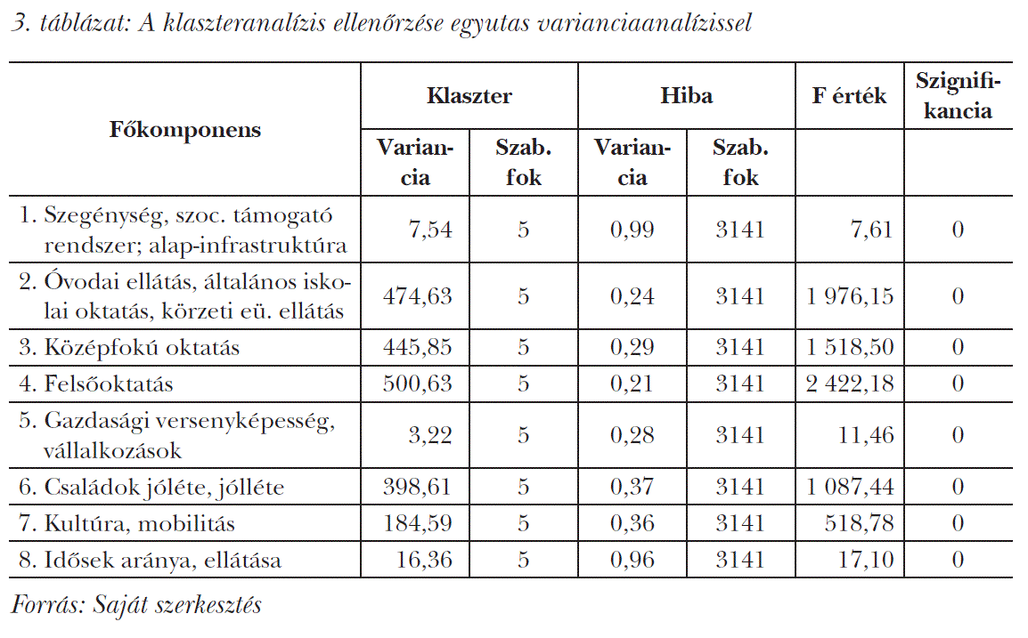 A varianciaanalízisből kiderül, hogy a klaszterek ténylegesen szignifikánsan, markánsan elkülönülnek egymástól az azokat alkotó változók (főkomponensek) mentén (Székelyi–Barna, 2002), így a települések valós csoportokba tömörülnek. Azonban a különböző főkomponensek igen eltérő mértékben járulnak hozzá a klaszterek egymástól történő elkülönüléséhez: az F-statisztika értéke nagyságrendileg alacsonyabb az 1. (szegénység és a rászorulókat támogató intézményrendszer; alapinfrastruktúra), az 5. (gazdasági versenyképesség, vállalkozások) és a 8. (idősek aránya, ellátása) főkomponens esetében. A települési adatsorok tükrében ez nem is lehet másképp, hiszen ezek nagyrészt olyan demográfiai vagy gazdasági jellemzőkből állnak, amelyek valamilyen értéket minden magyarországi település esetén felvesznek (a kiinduló koncepcióban ezek voltak a „külső adottságok”), míg a többi főkomponensben tömörülő közszolgáltatások egy nagy része csak bizonyos, az adott (al)központi funkcióval rendelkező településeken találhatók meg, a többi településen pedig nulla az egyes változók értéke. Ez utóbbiak alkalmasabbak a típusképzésre, a közszolgáltatások szintjeinek és ezáltal a településhierarchia megragadására.