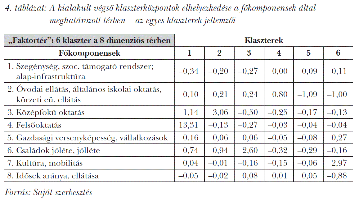 A nyolc, viszonylag jól interpretálható főkomponens már elég jól kezelhető ahhoz, hogy azokon klaszteranalízist hajtsunk végre a települések kategóriákba sorolása és ezek mentén történő nyolcdimenziós jellemzése érdekében. Tekintettel a viszonylag nagy adatállományra és még így is meglehetősen sok dimenzióra,4 az iterációs K-Means Cluster-eljárást alkalmaztuk az SPSS-programcsomag segítségével (Obádovics, 2009). A módszer kiszámítja a dimenziók magpontjait, és az azokkal kapcsolt elemeket mindaddig rotálja, amíg a klaszterközéppontok nem stabilizálódnak.