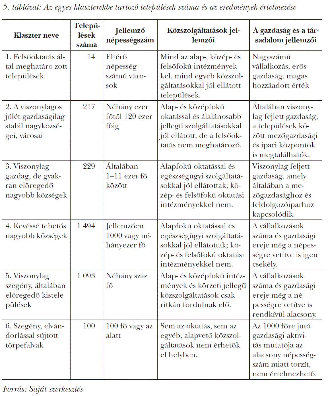 A 3147 települést felölelő, 6 csoportból álló klaszterstruktúra, amely statisztikailag is megállja a helyét (2. táblázat), már értelmezhető a magyar települések rendszerében és az azokat leíró főkomponensekben tömörített információtartalom fényében.
