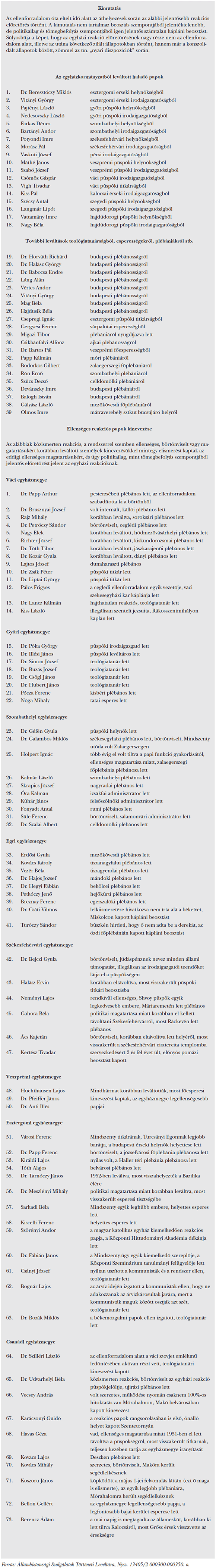 Az ellenforradalom óta eltelt idő alatt az áthelyezések során az alábbi jelentősebb reakciós előretörés történt. A kimutatás nem tartalmaz beosztás szempontjából jelentéktelenebb, de politikailag és tömegbefolyás szempontjából igen jelentős számtalan kápláni beosztást. Súlyosbítja a képet, hogy az egyházi reakció előretörésének nagy része nem az ellenforradalom alatt, illetve az utána következő zilált állapotokban történt, hanem már a konszolidált állapotok között, zömmel az ún. „nyári diszpozíciók” során.